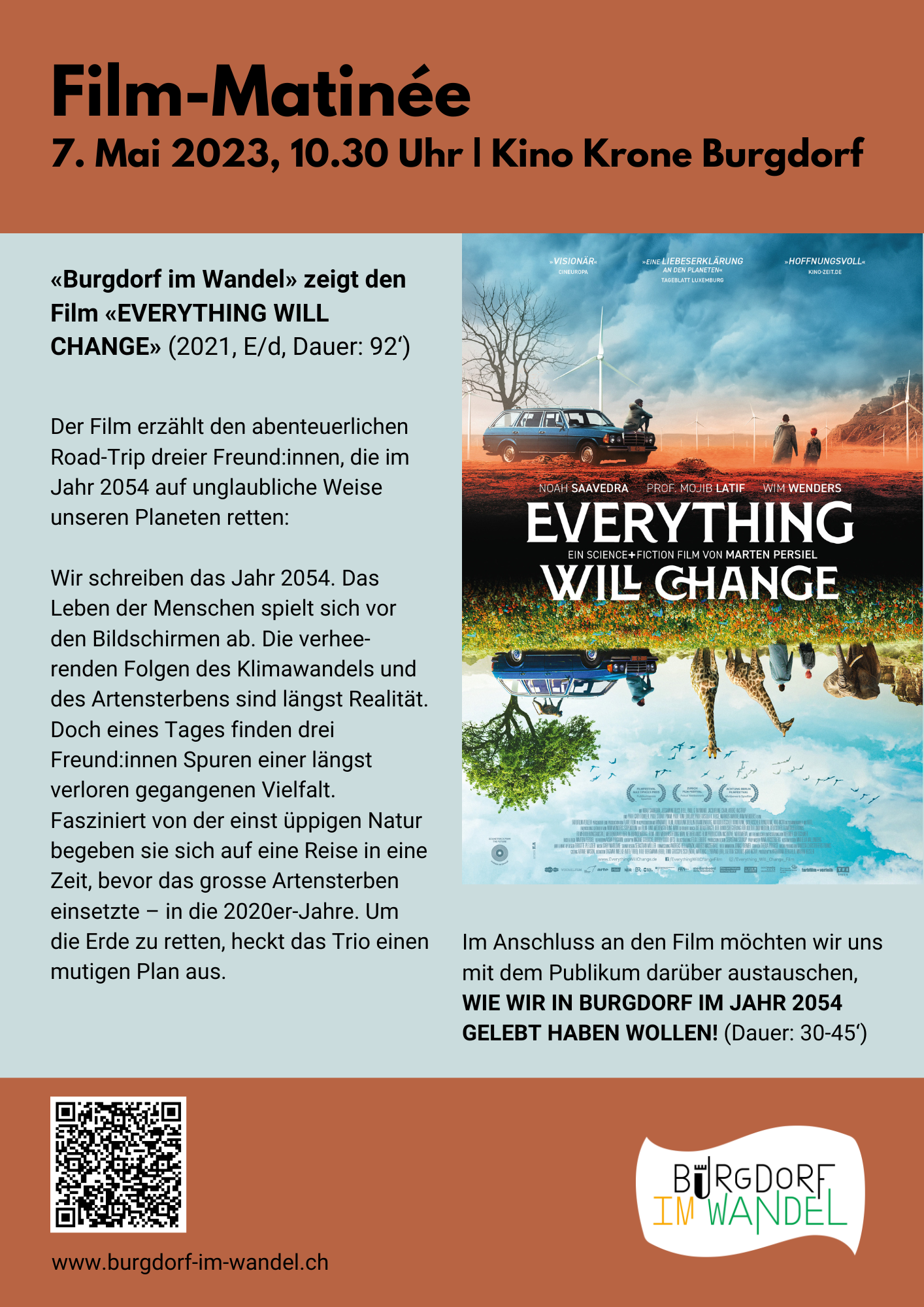 Wir zeigen den Film Everthing will change und diskutieren die Frage: Wie wollen wir in Burgdorf 2054 gelebt haben? Hier findest du den Flyer zur Veranstaltung.